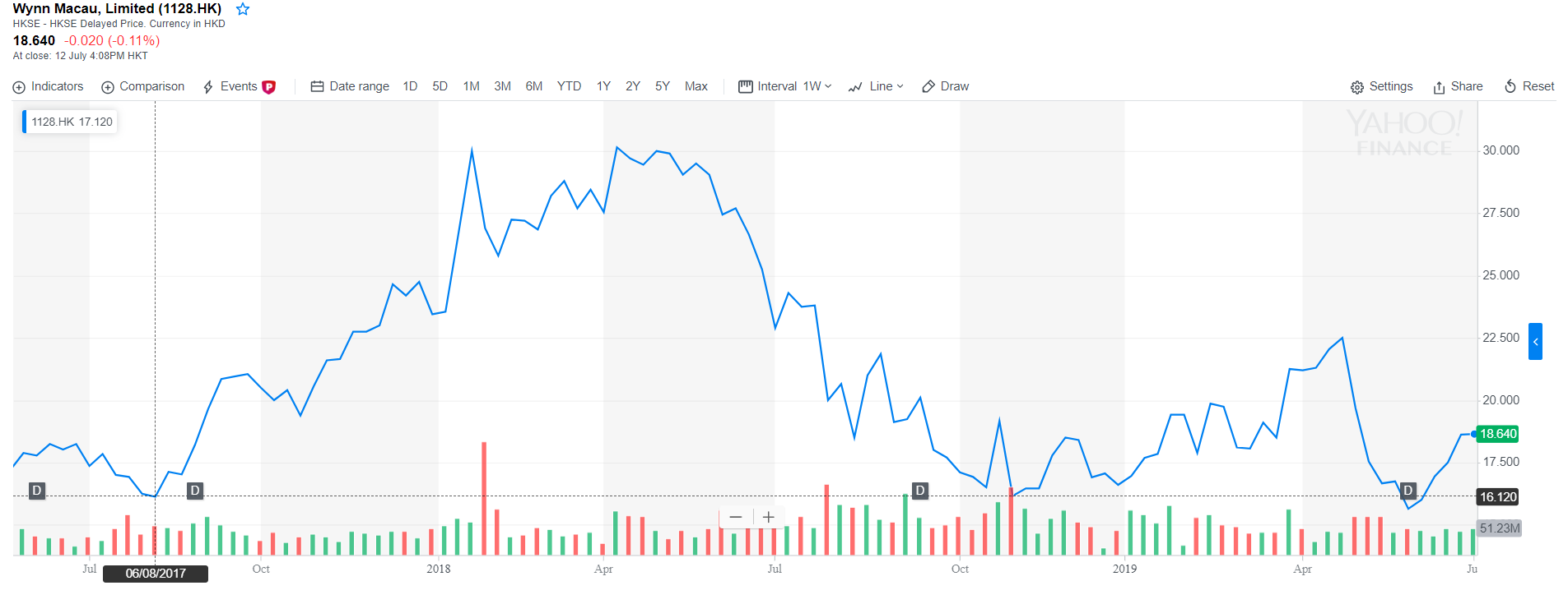 With Wynn Macau trading close to their 2 year low of 16.40, it seems like a stable support. I would expect volatility moving forward this year, due to the Macau elections and talks about renewing of licenses.