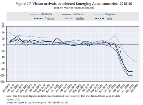 Travel and tourism were among the sectors worst impacted by the pandemic. As the spread of the virus unfolded, countries’ policy approaches in terms of regulating international flows evolved from screening or temporary quarantine to bans on all regions or even border closures. With travel restrictions were imposed in all countries in the region, this resulted in monthly visitor arrivals falling drastically beginning in March. By April, total visitor numbers across the region fell above 90%. This understandably led to an impact on airport passenger traffic.